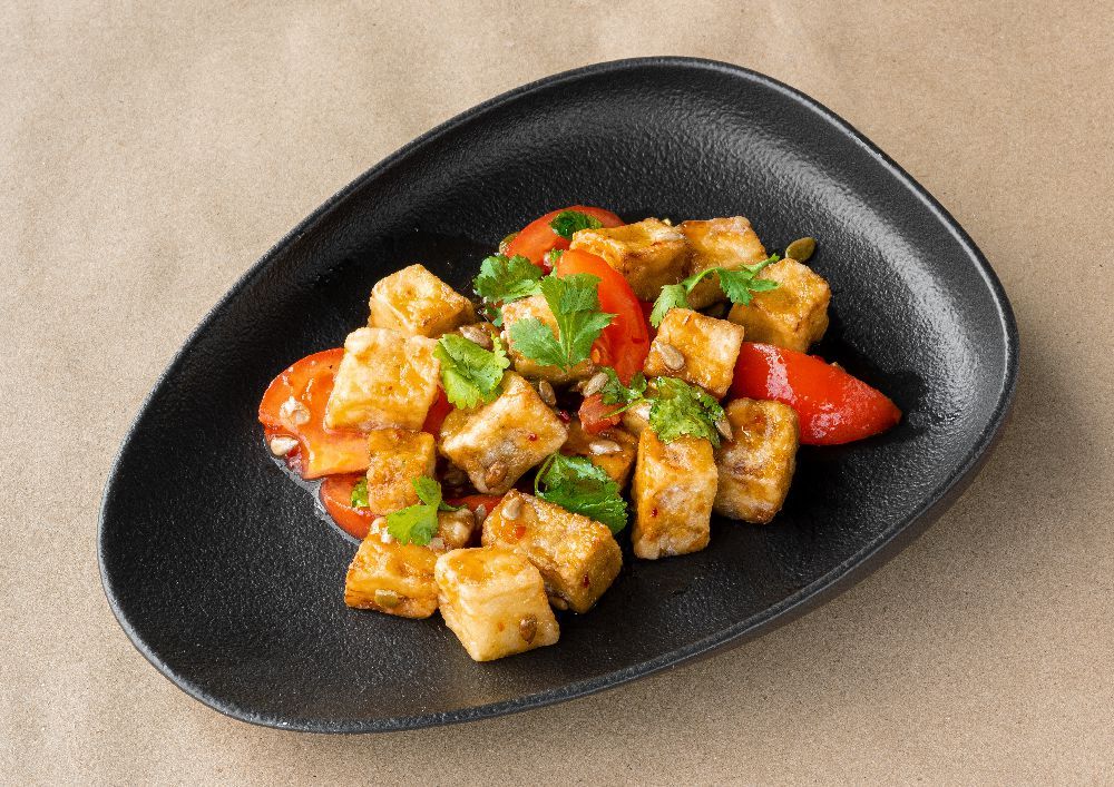 - Обжаренные баклажаны до хрустящей корочки в сладко-остром соусе Чили с дольками томатов, кинзой и миксом семечек