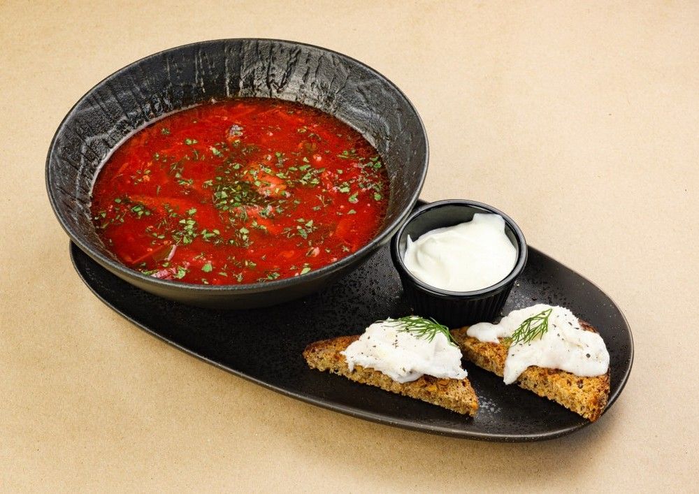 - С мраморной говядиной, подается со сметаной и тостами со взбитым салом