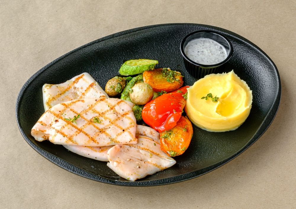 - Подается с овощами в соусе Песто и картофельным пюре с маслом Ги и тимьяном, сервируется грибным соусом