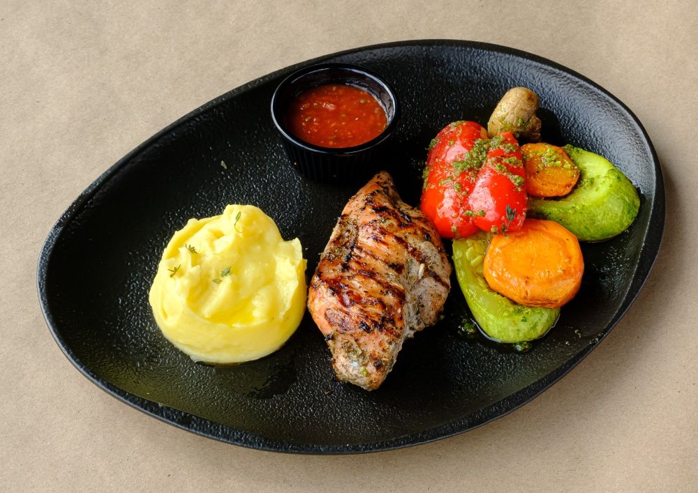 - Подается с овощами в соусе Песто и картофельным пюре с маслом Ги и тимьяном, сервируется соусом Томатная сальса