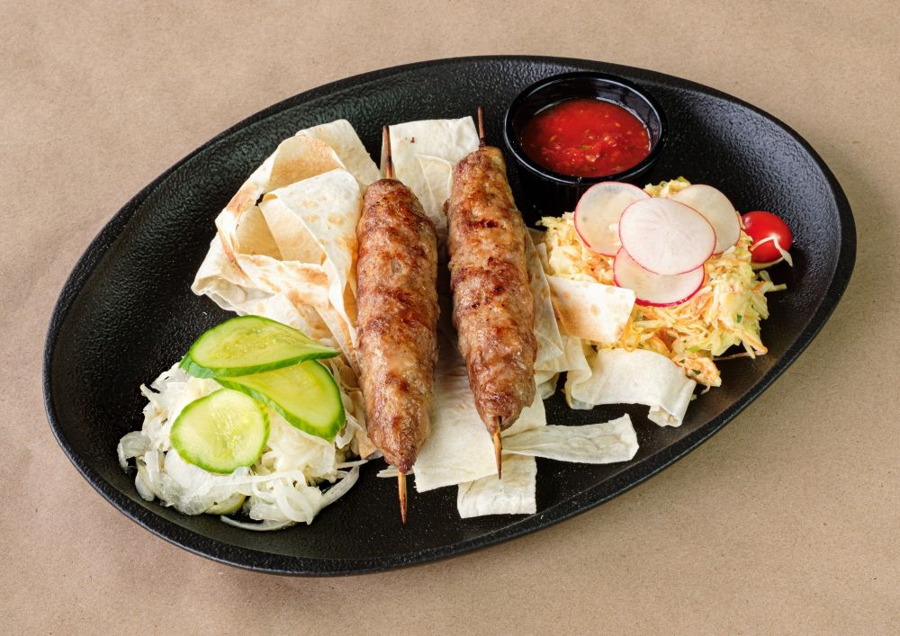 - Люля-кебаб из вырезки говядины и курицы, подается с тонком лавашем, маринованным луком, салатом Коул слоу из свежей капусты с морковью, малосольными огурчиками, редисом, помидором Черри и соусом на выбор: Брусника, Пеперончино, Томатная сальса