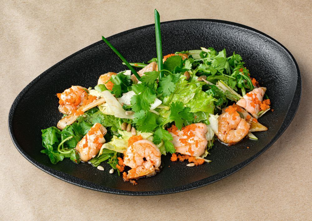 - Тигровые креветки и кальмар в сладком кунжутном чили соусе на подушке из микса салатов